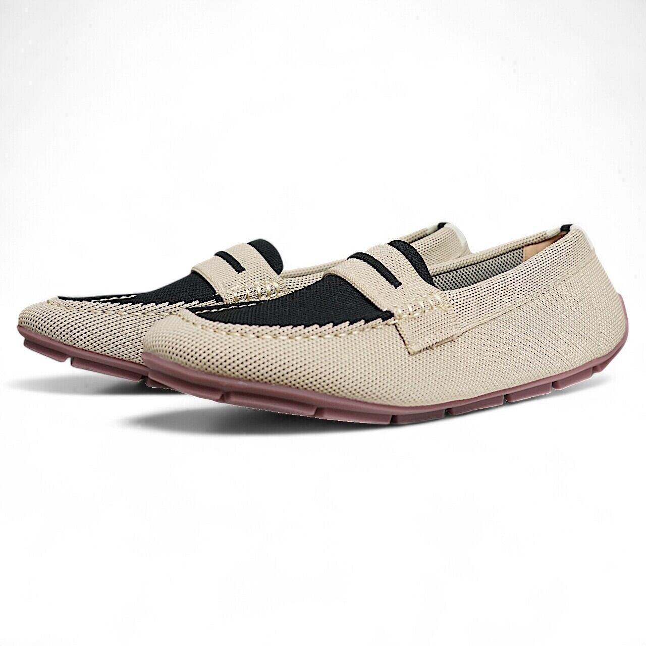 柔らかなニット素材を贅沢に使用した、スタイリッシュなデザインのニットローファーです。ベージュとブラックの上品なカラーリングが魅力で、カジュアルからフォーマルまで幅広いスタイルにマッチします。軽やかな履き心地で、一日中快適にお過ごしいただける一足です。洗練されたフォルムが足元を引き立て、どんなファッションにも特別感を添えます。