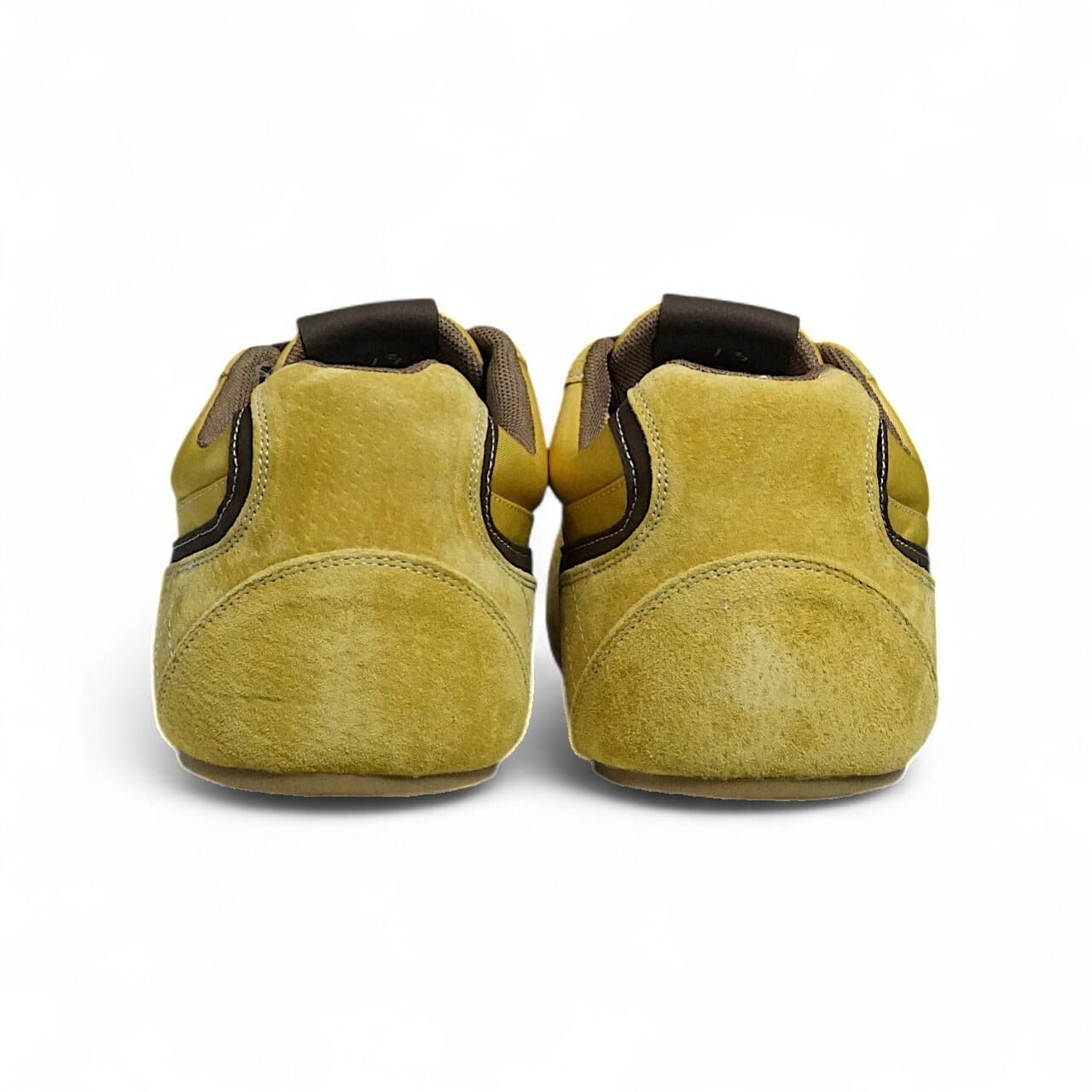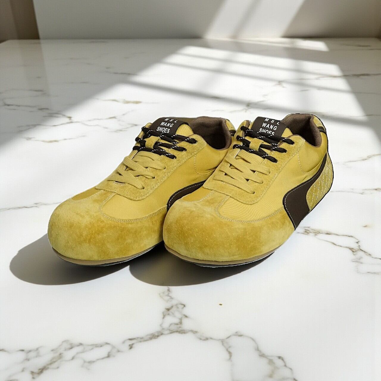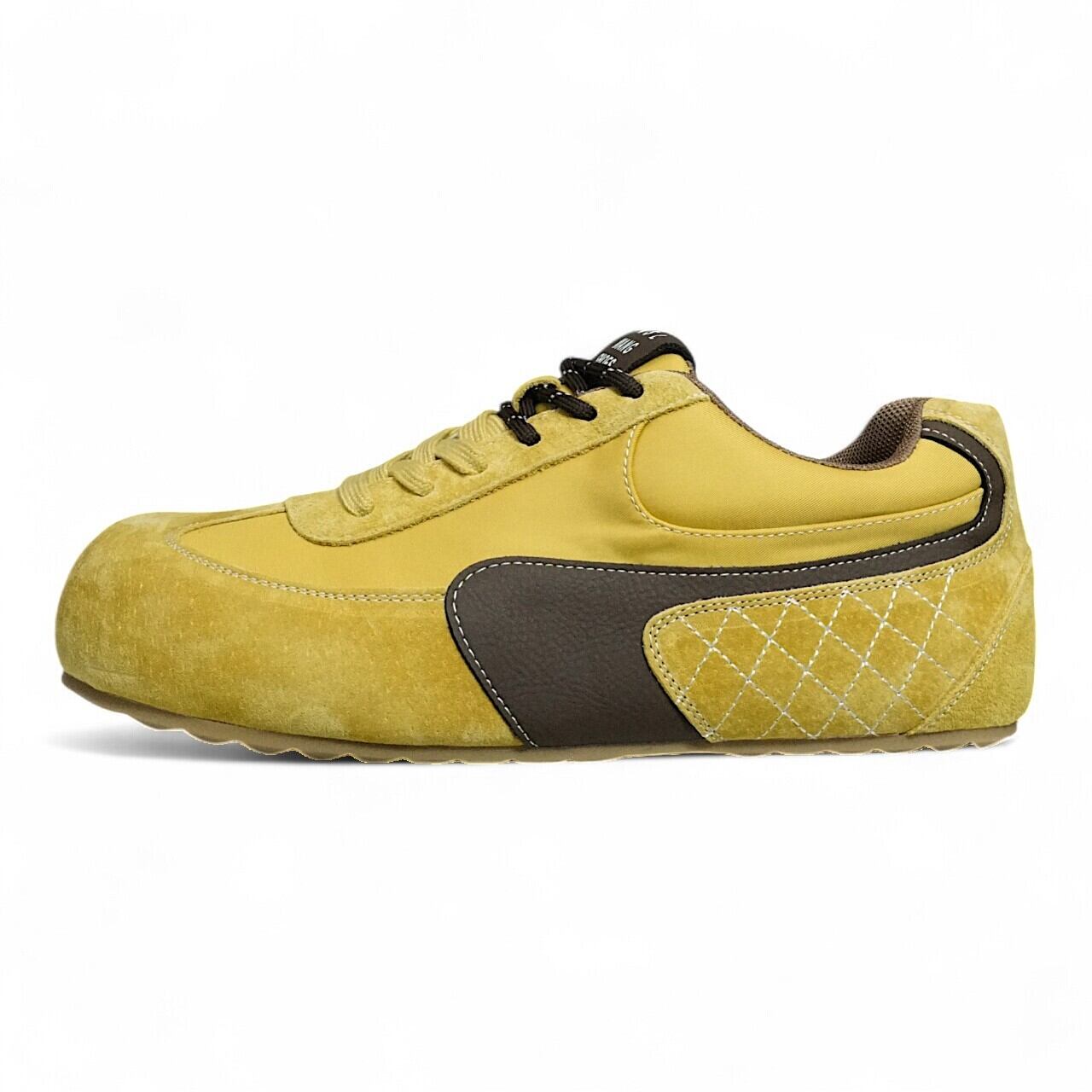 ■ Design - デザイン - つま先をぷっくりと丸く仕上げたユニークなシルエットはそのままに、素材とカラーでヴィンテージな雰囲気をプラス。 発色の良いイエローキャンバスと、温かみのある同系色のスエード調素材を組み合わせ、ブラウンのラインで引き締めたメリハリのあるデザインです。 どこか懐かしく、でも新しい。デザイナーズブランドのような存在感を放つ一足です。